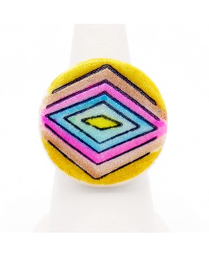 Continuing in originality and 100% handmade, we present this adjustable ring adorned with diamonds. Featuring a 2.7 cm diameter, the cabochon crafted from white polymer clay transforms into vibrant and original colors in the form of hypnotic diamonds. This multicolored ring is a unique piece, with its lightweight design offering comfortable wear. It is available as a one-of-a-kind creation.