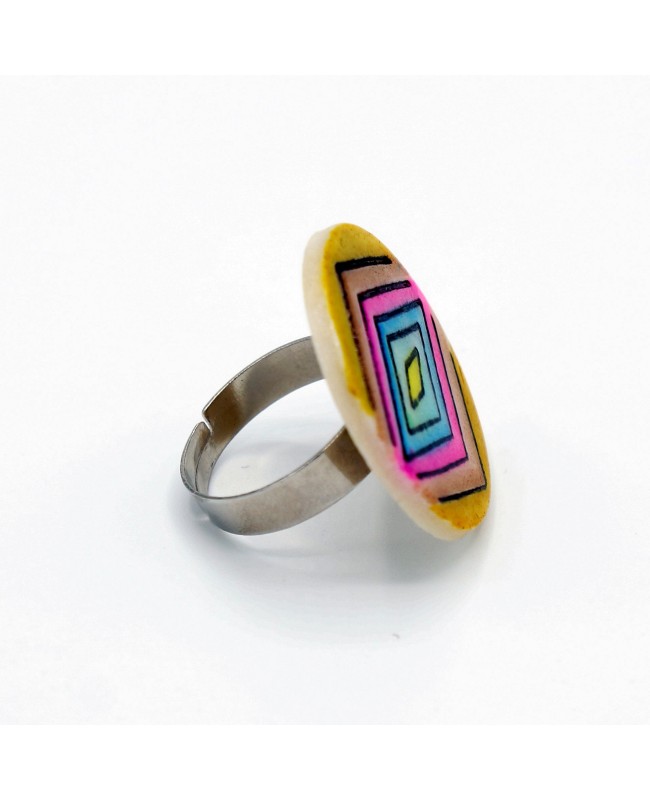 Introducing a new adjustable ring with a polymer clay cabochon on this website, this costume jewelry has been meticulously crafted by us. On a base of slightly sparkling white polymer clay, we added a pattern of diamonds, which was then colored with alcohol inks. This ring features a multicolored design ranging from blue to yellow and touches of pink. The cabochon has been securely attached to an adjustable ring base, allowing you to customize the size for a perfect fit on your finger. The result is simple, lightweight, yet effective with its vibrant colors that bring calmness, serenity, and most importantly... good vibes!