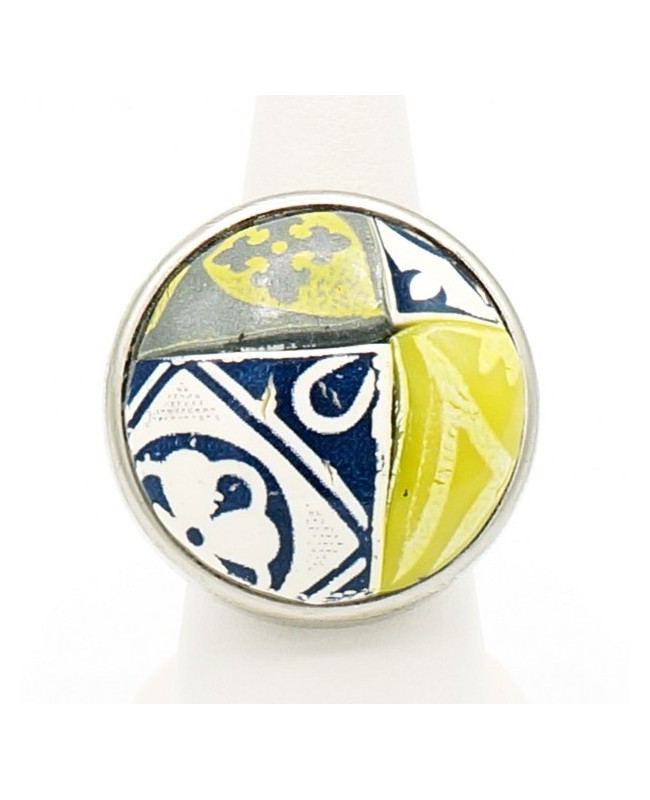 A resemblance to faience can be noticed in this large yellow, blue, gray, and white ring. The cabochon was designed by us and has a diameter of 3 cm. No size issues as the silver metal support is adjustable. You can therefore modify its size.