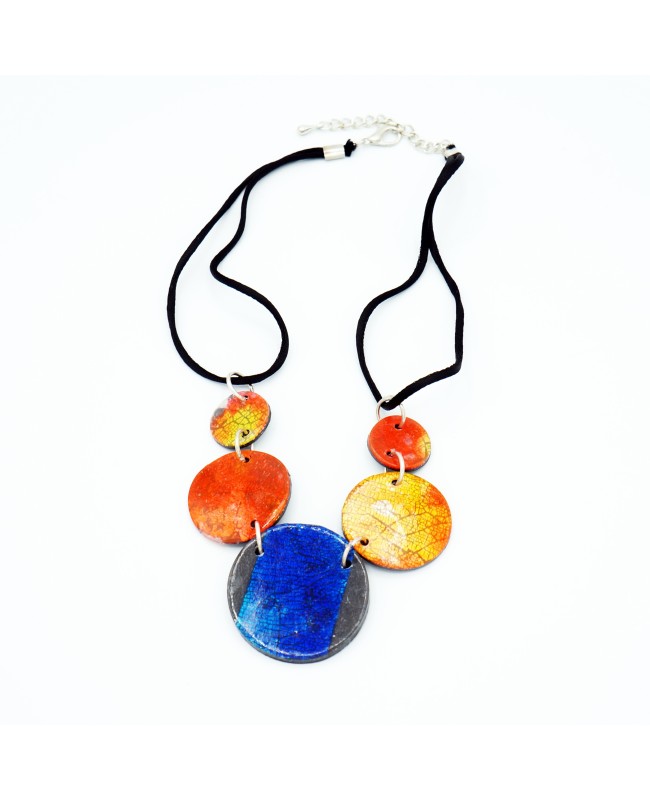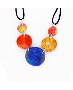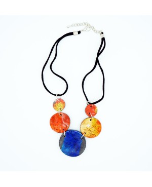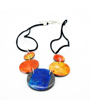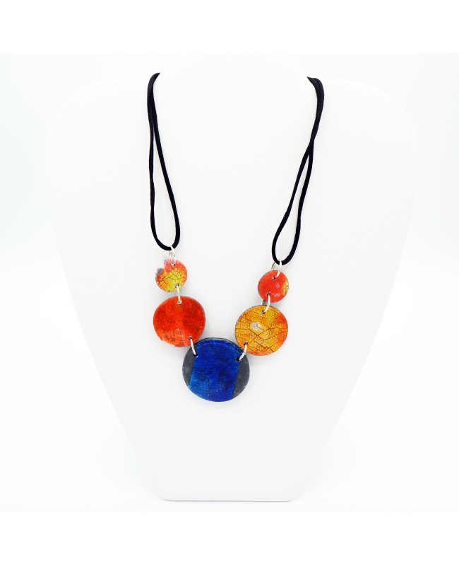 In the center, a flat blue and black lens reminiscent of Murano beads. On each side, orange and yellow beads with metallic reflections. Together, they form a stunning mid-length necklace measuring between 45 and 50 cm.