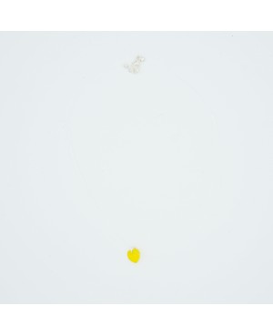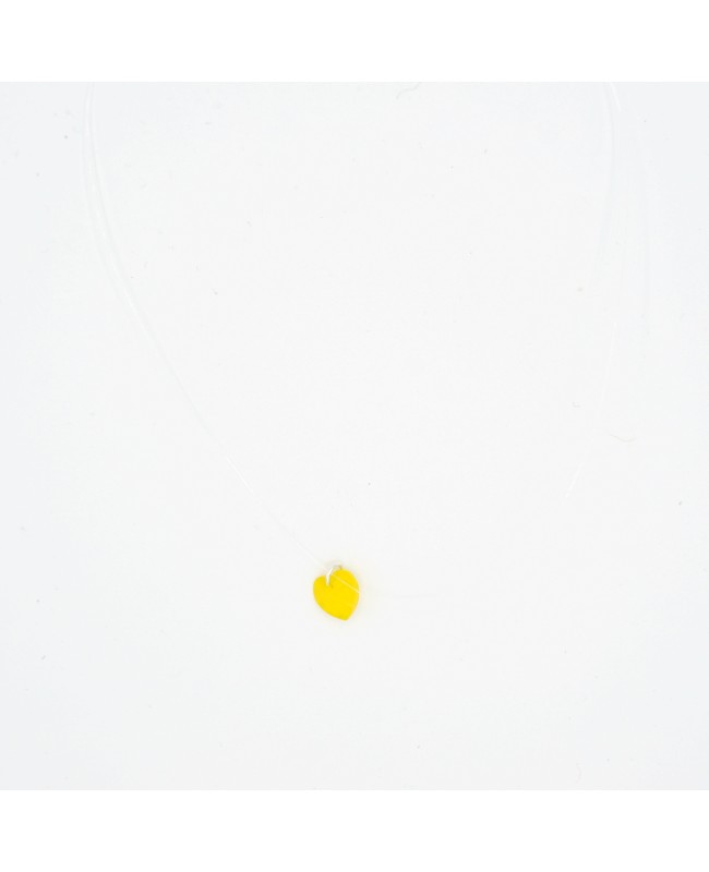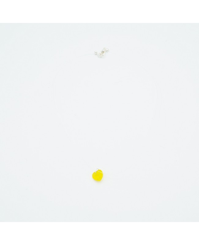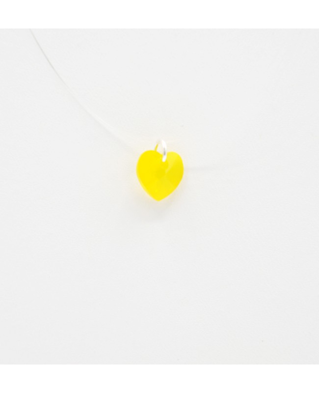 Paired with its transparent nylon cord, this small, bright yellow, slightly transparent heart pendant makes the perfect gift. Simple, original, and easy to wear, it stands out for its petite size. Made from Swarovski crystal, it catches the light beautifully, giving off a vivid glow. Its yellow color, clear nylon cord, and choker style make it an easy-to-wear necklace that attracts attention while remaining subtle.