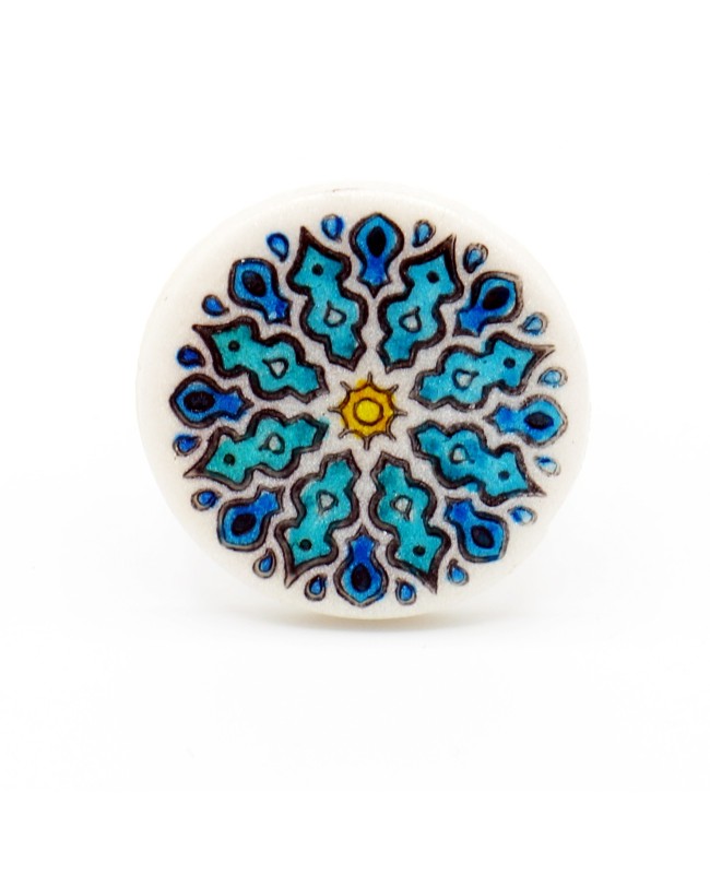 One last journey to Asia with this adjustable mandala ring. With a diameter of 2.7 cm, the white polymer clay cabochon features bright and original colors in the form of a mandala pattern. For this ring, the dominant colors are blue and yellow. Lightweight and comfortable to wear, it is available in a single unique piece.