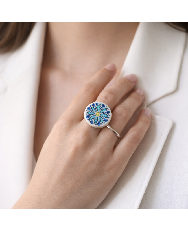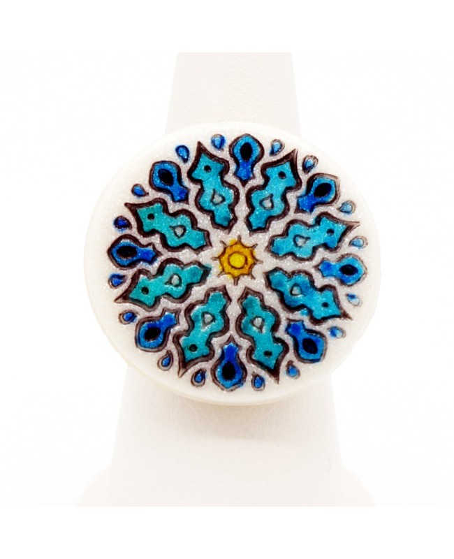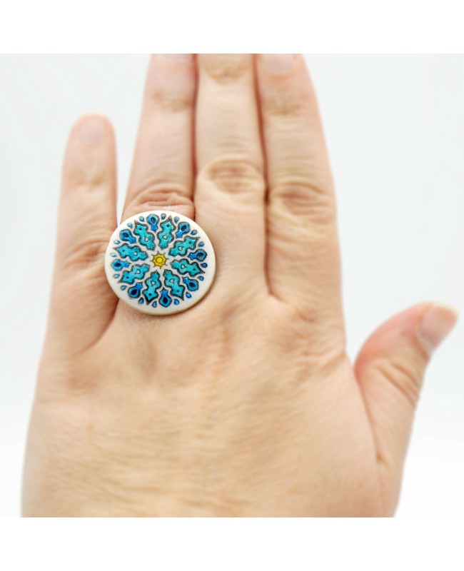 The mandala is now featured in our jewelry with this ring handmade by us. On a slightly glittered white polymer clay base, we added a mandala motif which was then colored using alcohol inks. The dominant colors of this ring are therefore blue with a small touch of yellow. This cabochon was then fixed onto an adjustable ring base so that you can adapt the size of the ring to your finger. The result is simple, lightweight, yet effective, with bright colors that will bring you calm, serenity, and above all… good mood!