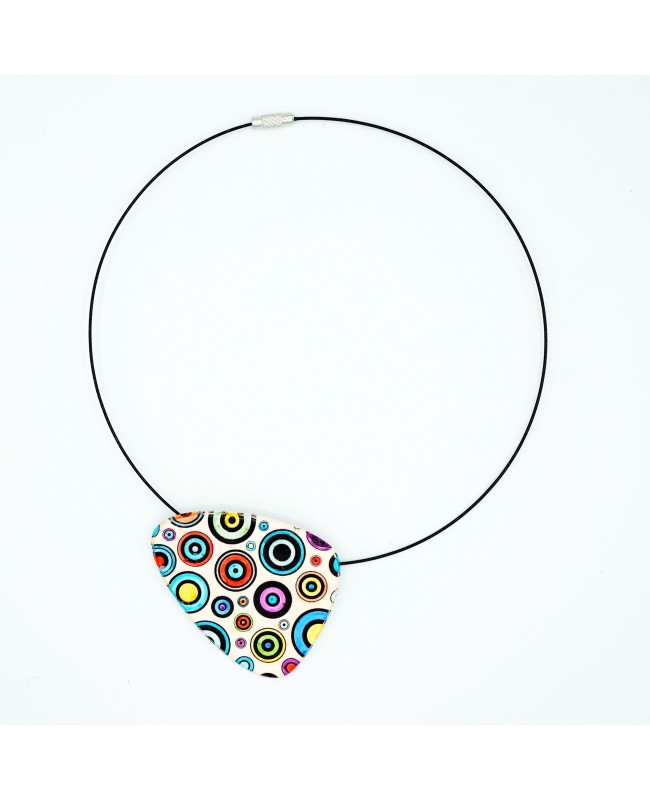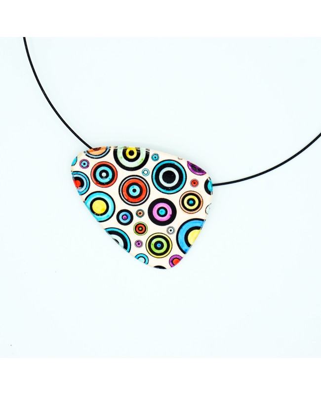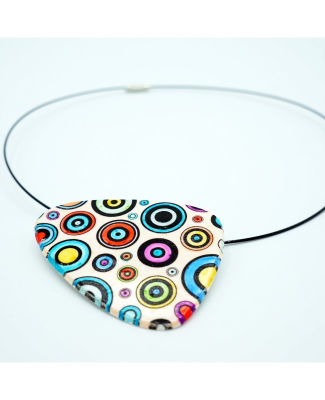 Get ready to embrace vibrant colors and joyful energy with this 100% handmade choker necklace. The pendant, measuring 6 cm in length and 5 cm in height, is meticulously crafted from high-quality white polymer clay. On this white base, we've created a circle pattern and hand-colored each section using alcohol inks. The entire piece is sealed with a protective varnish. The result is a hypnotic and striking visual effect. Bright, vivid colors blend together harmoniously—from fiery reds to deep blues, emerald greens to sunny yellows, and so much more.