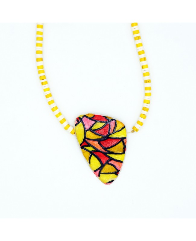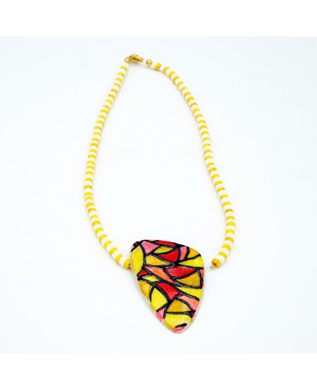 Add a touch of sparkle and color to your outfit with this stunning short necklace in yellow, white, and red. It features a central stained-glass-style pendant measuring 4.5 cm long by 3.5 cm high. The flat yellow and white polymer clay beads surrounding the pendant create a beautiful color harmony for an elegant and sophisticated look.