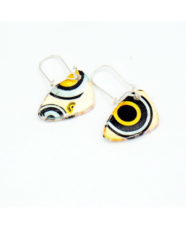 To express your personality, nothing beats these fully handmade earrings. The triangular part was crafted in our workshop from polymer clay, onto which we added a black pattern. The concentric circles were then hand-painted. The multicolored touch brings a hint of modernity to the design. These earrings are finished with silver-tone metal findings. The total length is 4 cm.