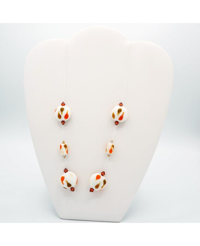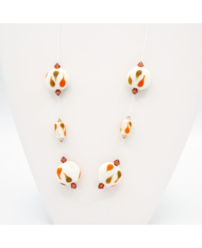 Our mid-length necklace is crafted with meticulous attention to detail and made from high-quality materials to ensure both durability and exceptional aesthetics. The white, orange, and brown glass beads are carefully arranged to create a harmonious piece of jewelry.