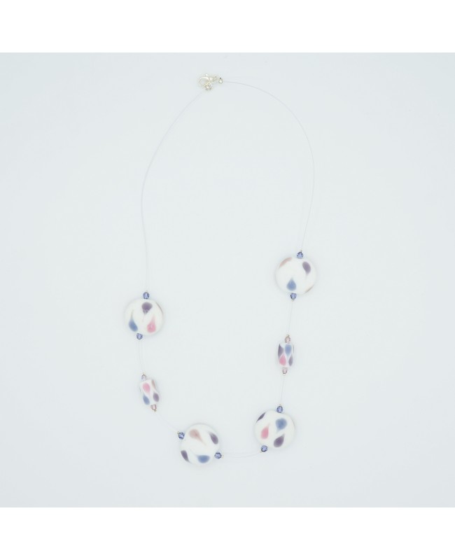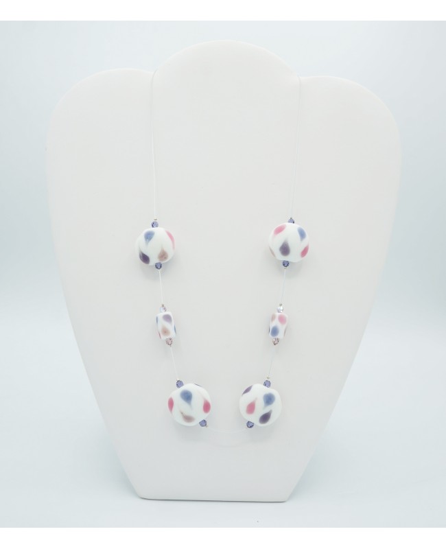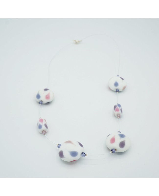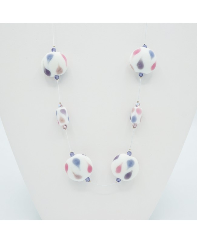It is worn mid-length and measures 55 cm in length. This fashion necklace is crafted from glass beads with a matte finish. The beads are white with delicate violet or pink drops. Each bead is framed by small crystal bicone beads.