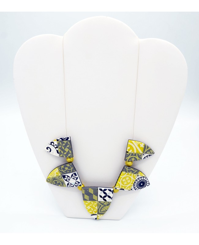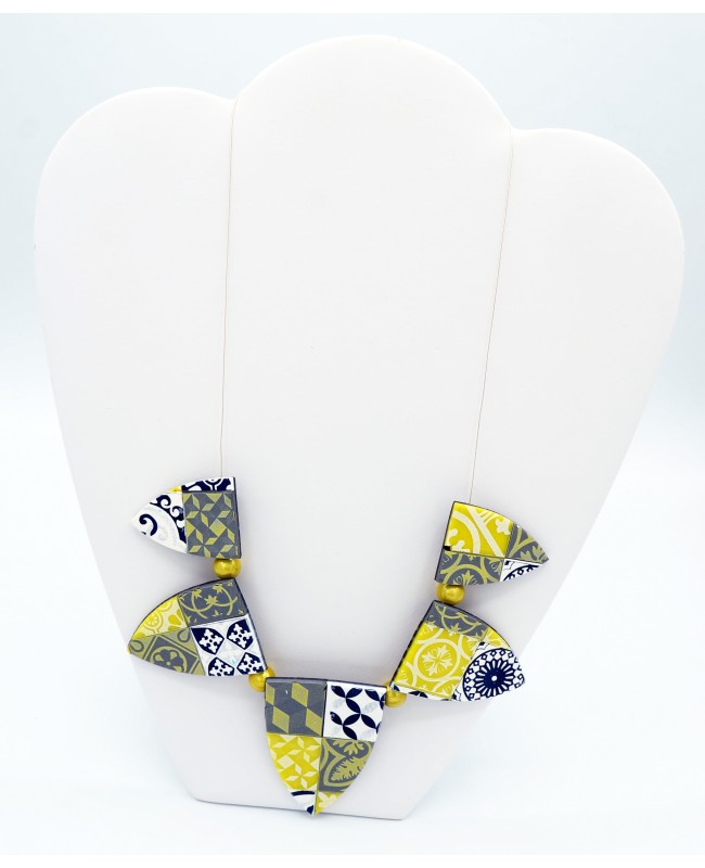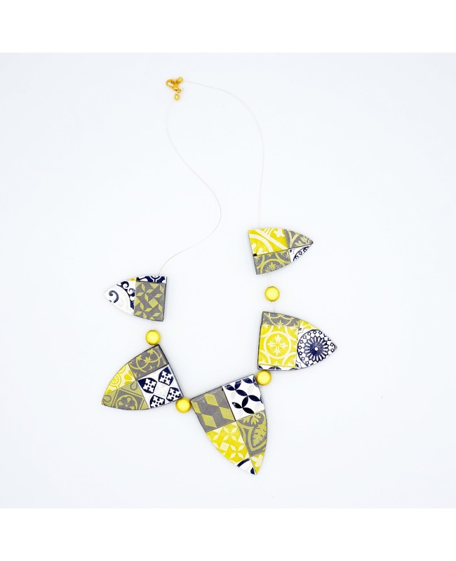 A hint of the Middle Ages for this necklace with its pendant pieces shaped like banners. Each banner is made up of several tiles reminiscent of faience. The whole piece is in white, yellow, grey, and navy blue, with yellow beads adding a touch of modernity.