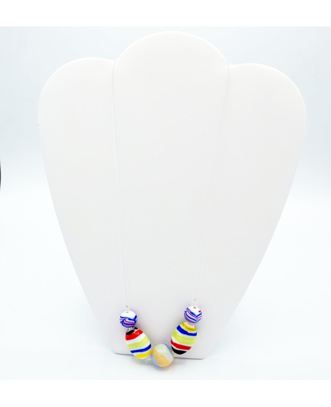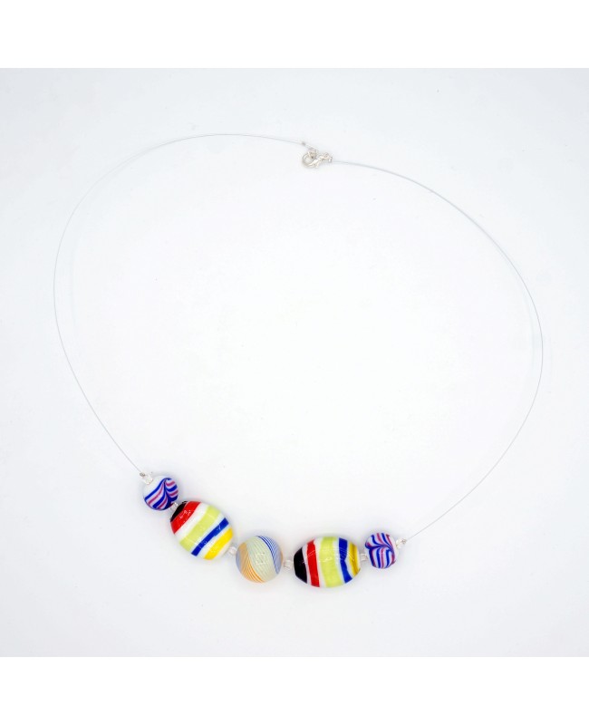 This mid-length necklace will not go unnoticed thanks to its multicolored beads. All of them are made of glass and feature parallel lines. The central bead is slim and slightly transparent. The beads on each side are oval and flat, while the last ones are smaller and round. Each bead is separated by a small, transparent, faceted bead. The beads are strung on a white cable wire, which enhances their colors even more. The necklace is finished with a silver-toned metal clasp.