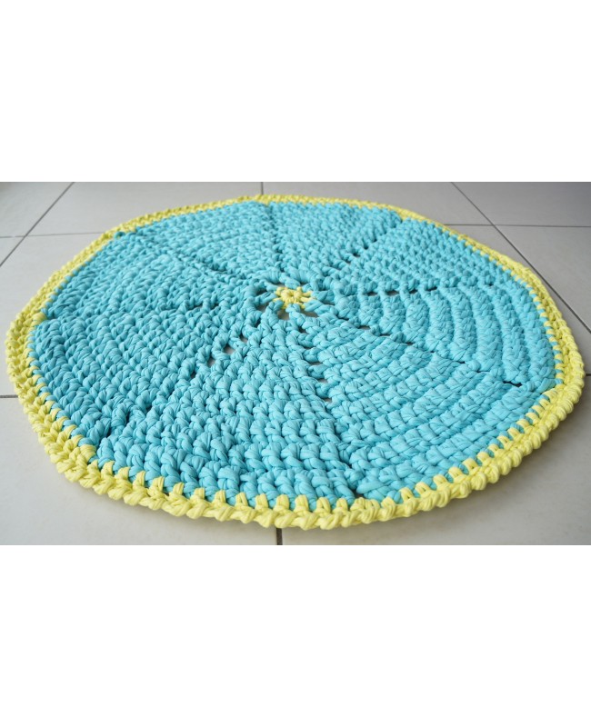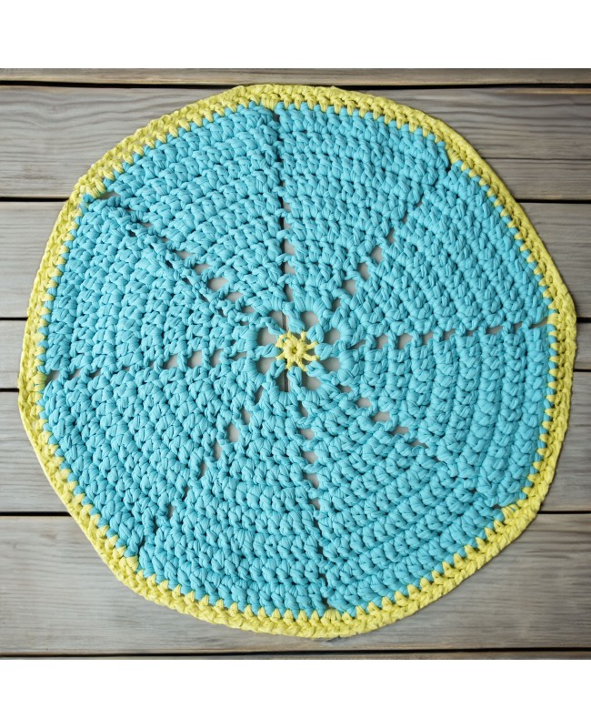 Discover our beautiful openwork round crocheted rug. This yellow and turquoise rug, measuring 66 cm in diameter, is a handcrafted creation made in our workshop with care from recycled cotton.