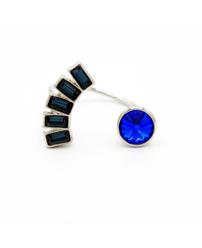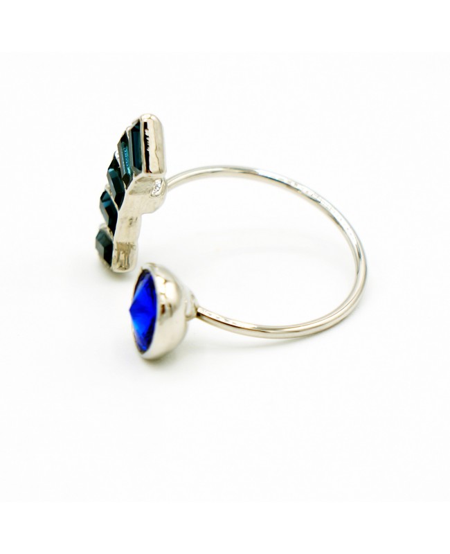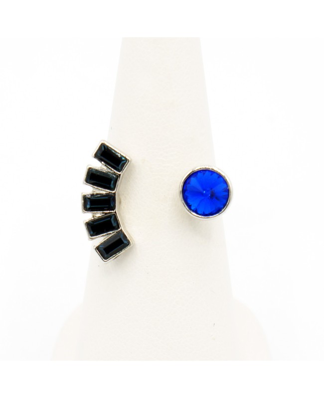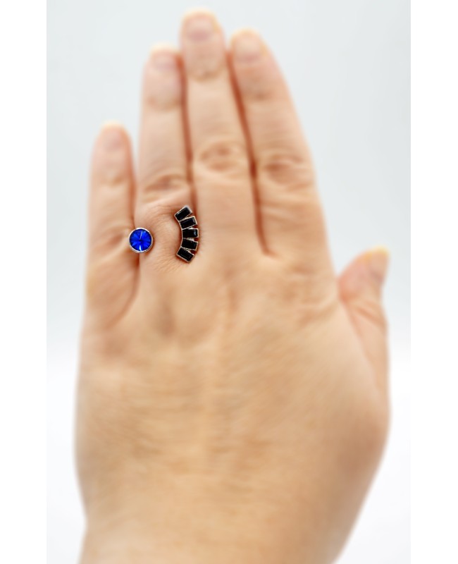 This adjustable ring stands out for its unique shape. With an opening at the top, you can easily resize it to fit your finger. On one side, small grey-blue crystals are set in a fan-shaped design. On the other, a round blue cabochon adds a striking contrast that enhances the whole piece. All crystals have been carefully set by hand. The ring’s band is made of silver. The final look is somewhere between an eye, the sun, and a fan.