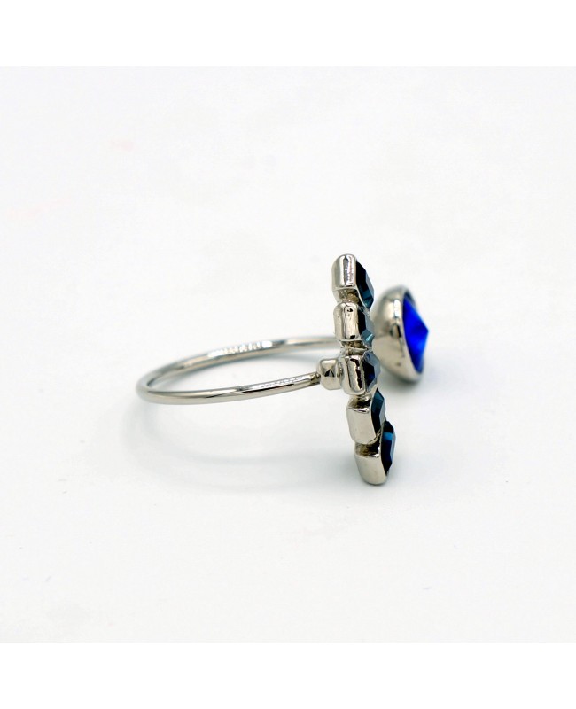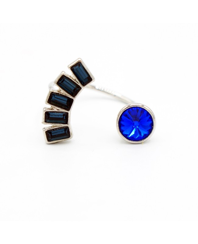 This adjustable ring stands out for its unique shape. With an opening at the top, you can easily resize it to fit your finger. On one side, small grey-blue crystals are set in a fan-shaped design. On the other, a round blue cabochon adds a striking contrast that enhances the whole piece. All crystals have been carefully set by hand. The ring’s band is made of silver. The final look is somewhere between an eye, the sun, and a fan.
