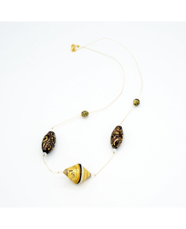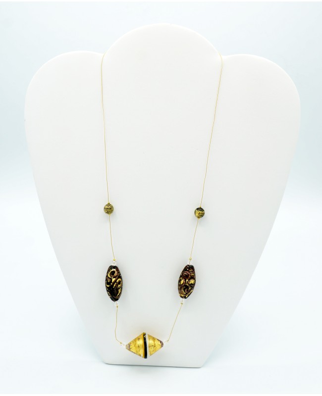 If you love gold-toned fashion jewelry, this mid-length necklace is just for you. Strung on a gold-colored wire, it features carefully arranged glass beads. The central bead is shaped like a spinning top and is surrounded by transparent faceted beads. The olive-shaped beads are brown with golden spirals and are also framed by faceted beads. Small round beads complete the piece. The total length of the necklace is 60 cm, making it a mid-length accessory.