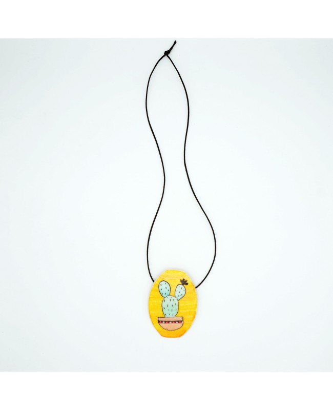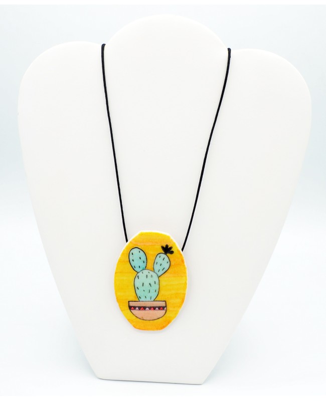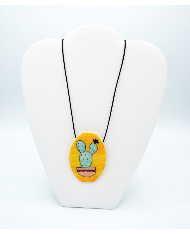 If you love original, 100% handmade jewelry, you’ll love this long necklace. The cactus pendant is a unique creation handcrafted from polymer clay. Set on a white base, we've added a design representing a cactus in a pot. A fresh and original nod to nature, this pendant measures 5.5 cm wide by 8.5 cm long. It hangs from a sleek black satin cord.
