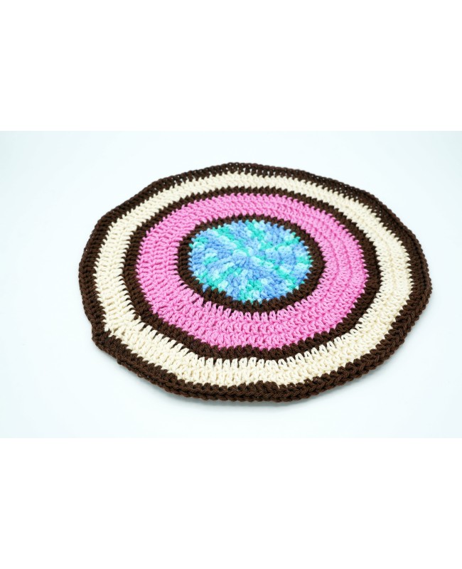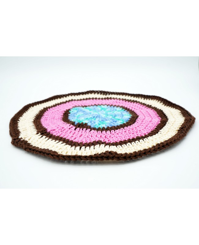 A touch of modernity and originality for this doily, entirely handmade in our workshop. It was crocheted using high-quality cotton yarn. Its round shape and the alternation of bright colors give it a modern look, while the rounded edges reflect the traditional charm of classic doilies. The dominant color is brown, but beige, pink, and blue bring contrast and a fresh, contemporary feel. It measures 25 cm in diameter.