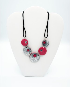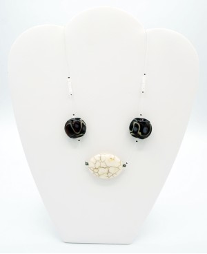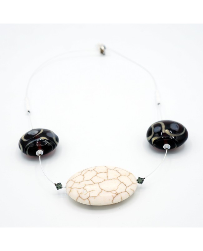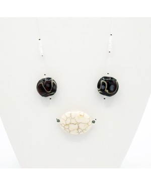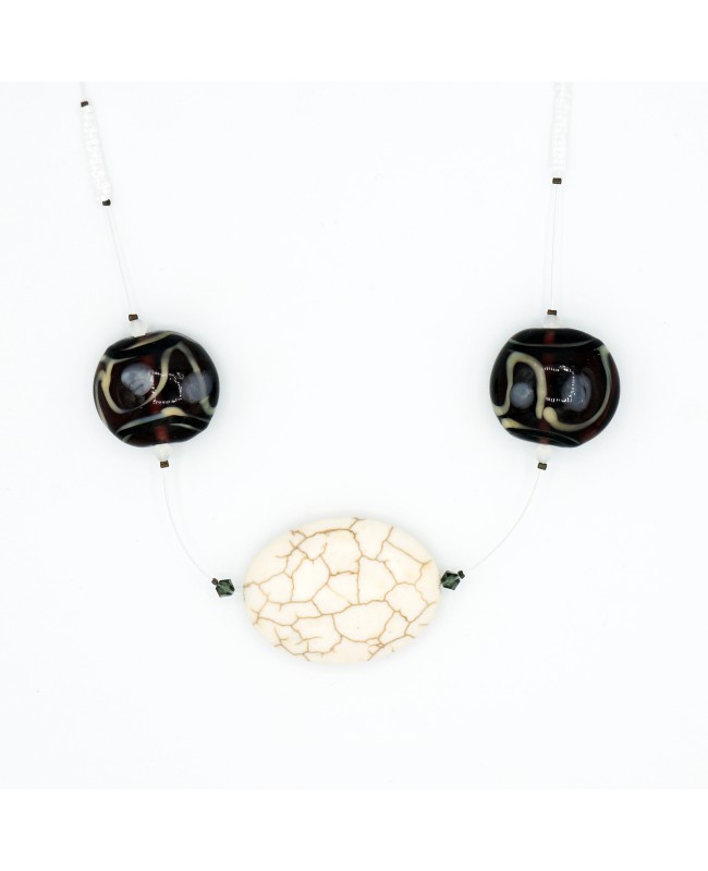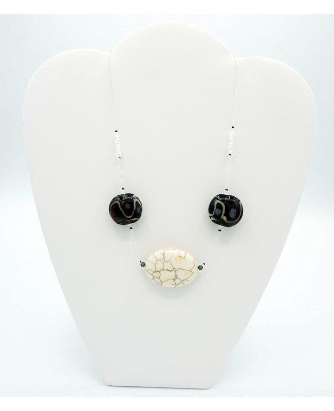 This elegant necklace showcases a unique and refined design. It features three main beads strung on a white cord, giving it a light and delicate appearance. At the center is a large oval white bead with natural crackled patterns reminiscent of marble or weathered stone. Flanking the central bead are two round black glass beads adorned with white circular patterns, adding a sophisticated contrast. Small silver and transparent beads surrounding the main elements provide a subtle touch of sparkle. Delicate white beads placed after the black ones elegantly complete the design with a refined finish.