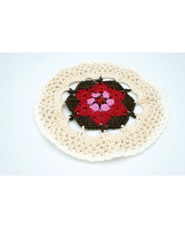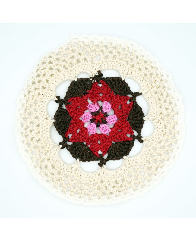 Add a touch of modernity and originality to your décor with this doily, entirely handmade in our workshop. Crocheted with high-quality cotton yarn, it features a round shape and stands out thanks to its bright colors, which give it a contemporary style. Its scalloped edges recall the traditional charm of classic doilies. The dominant shade is beige, subtly contrasted with touches of brown, pink, and red, creating a harmonious and modern composition. With a diameter of 19.5 cm, this doily is perfect for enhancing your table.