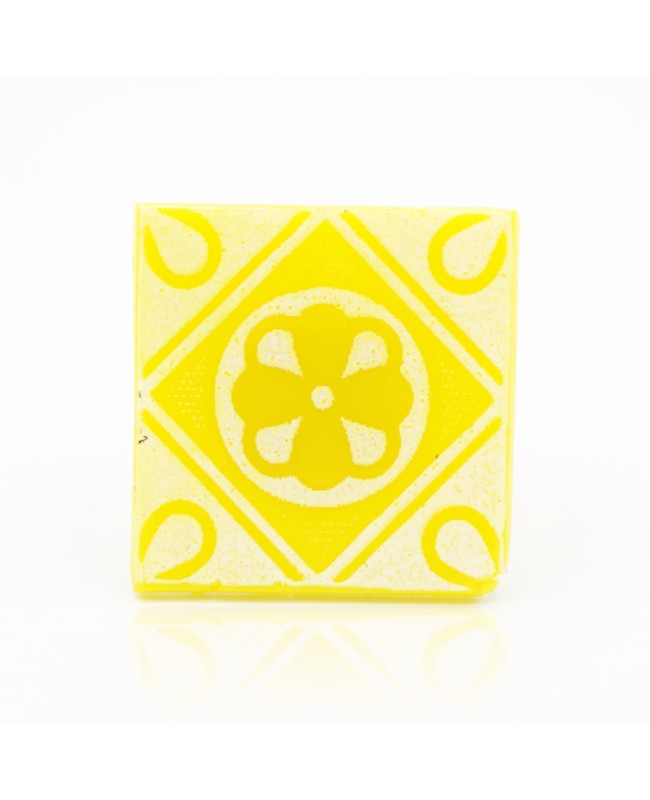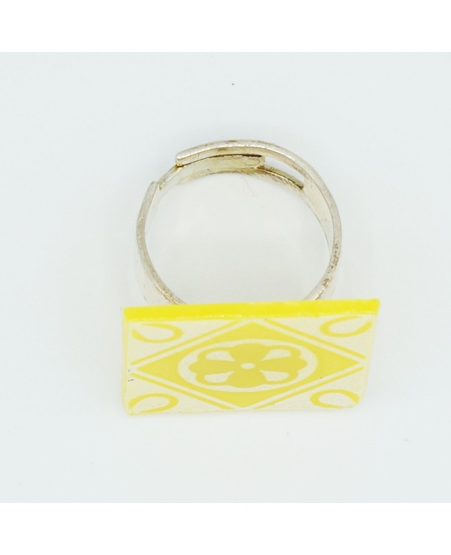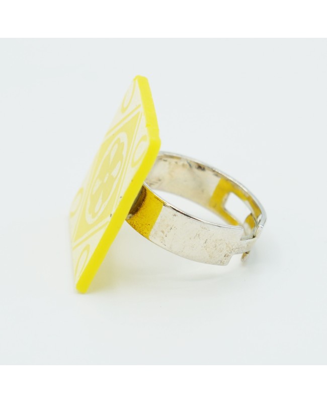This square fancy ring, yellow with a faux ceramic look, measures 2.5 cm on each side. It is handmade from polymer clay. Its silver-plated metal band can be adjusted to fit your finger size.