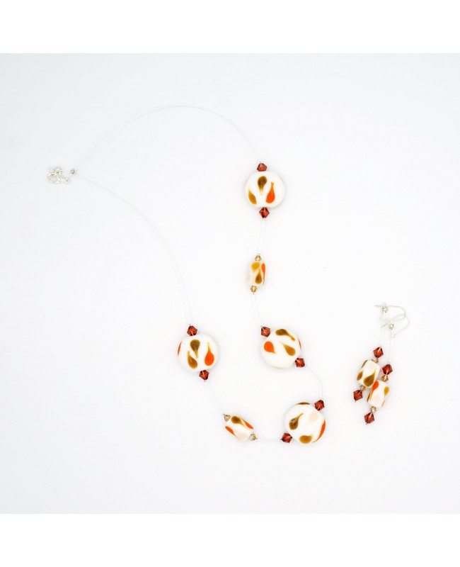 This costume jewelry set, consisting of a necklace and matching earrings, combines elegance and delicacy with its matte glass and crystal beads in soft pastel tones of white, brown, and orange.