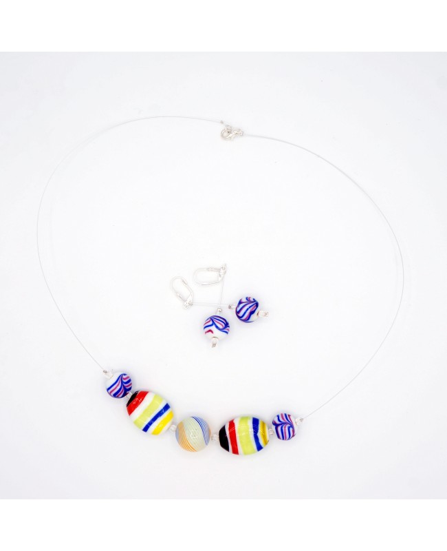 These handcrafted pieces, available as a unique creation and exclusively sold on our website, bring a touch of elegance and originality. The 63 cm mid-length necklace features multicolored glass beads arranged in parallel lines, strung on a white cable wire, and secured with a silver-tone metal clasp. The matching 6.5 cm earrings combine glass and crystal beads, with a main bead reminiscent of childhood marbles. Carefully crafted in an artisanal workshop, these costume jewelry pieces support local craftsmanship and commerce.
