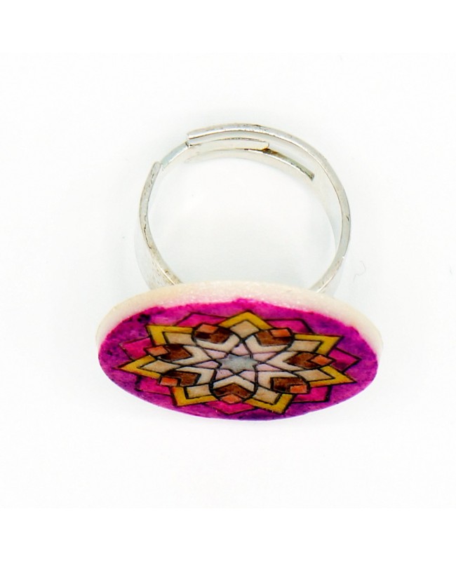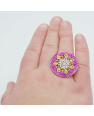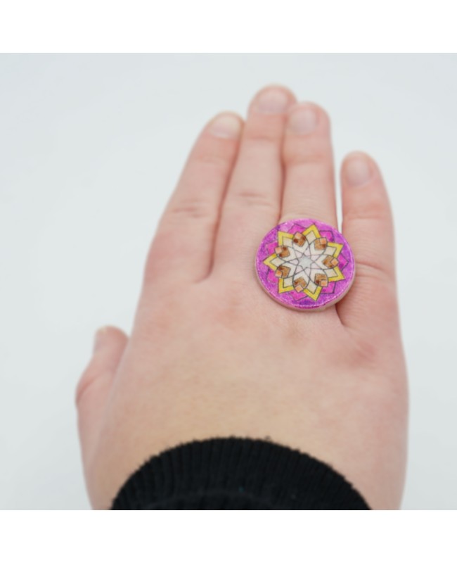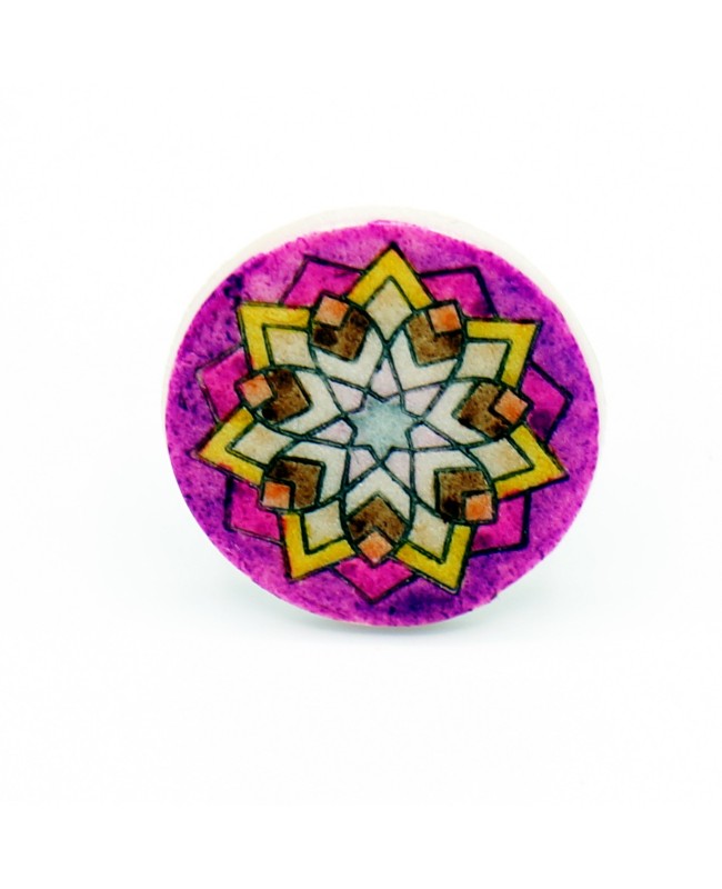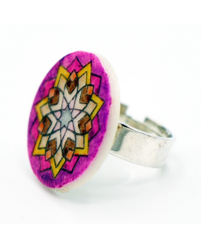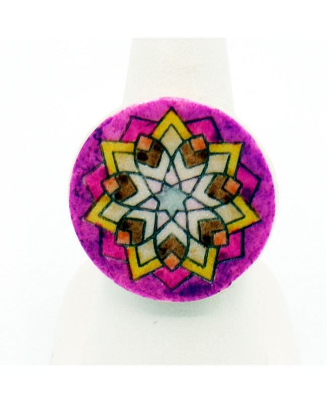 This fancy ring is a one-of-a-kind piece, entirely handcrafted in our workshop. Made from polymer clay, it features a star-shaped mandala in vibrant shades of yellow, brown, and purple, giving it a distinctive and bold look. The colors were applied by hand, and we finished it with a glossy varnish to protect the design. The mandala cabochon is mounted on a silver-toned adjustable ring base, ensuring a perfect fit on any finger.