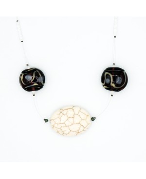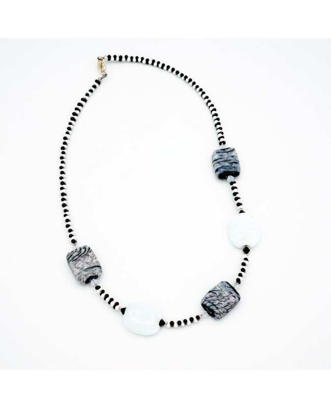 With its deceptively classic look, this necklace is a unique piece handcrafted in our workshop. The five main beads are made of glass and are beautifully framed by crystal bicone beads. The rest of the necklace is composed of black and white butterfly-shaped seed beads that fit together perfectly, creating a textured, dimensional effect that adds a touch of originality to the whole design.