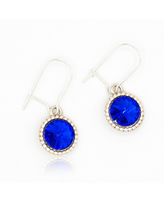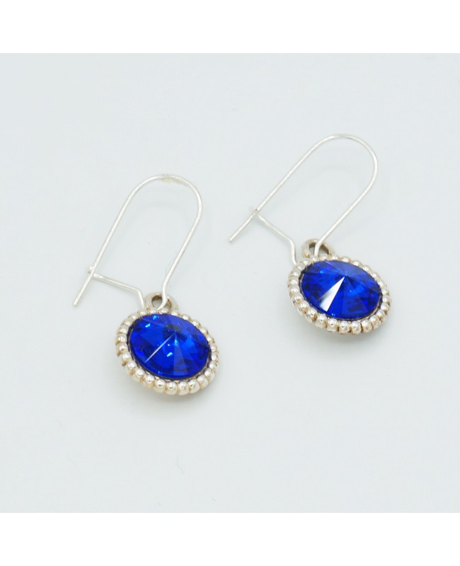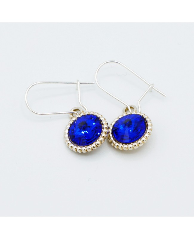 Now is the time to express your personality with these blue earrings. The blue cabochons are made of crystal and set on a silver-colored metal base. A small metal relief highlights and enhances the electric blue of the cabochon. The round element has a diameter of 1 cm and is attached to a silver-colored metal earring hook. The vibrant blue of the cabochons adds a modern touch to your outfit while maintaining a classic look thanks to the shape of the setting. The total length of the earrings is 2.5 cm.