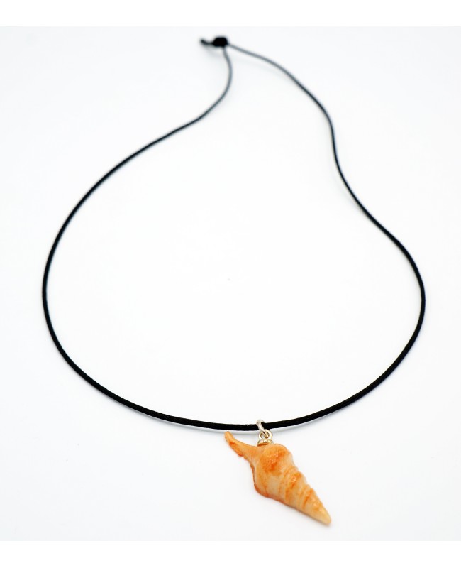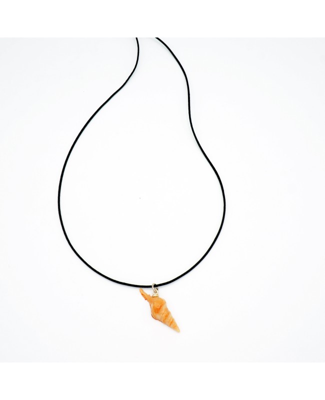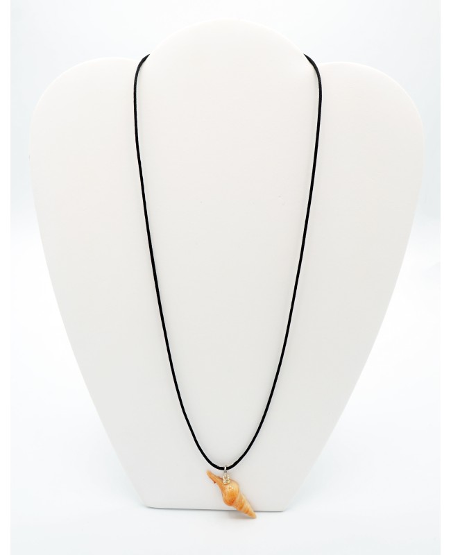 Add an ocean-inspired touch to your style with this cone-shaped seashell necklace made of polymer clay. Carefully handcrafted, it charms with its realistic look and glossy finish. Lightweight and comfortable to wear, it comes on a black cord that easily complements any outfit. An artisanal piece of jewelry, perfect for a bohemian, summer, or sea-inspired vibe.