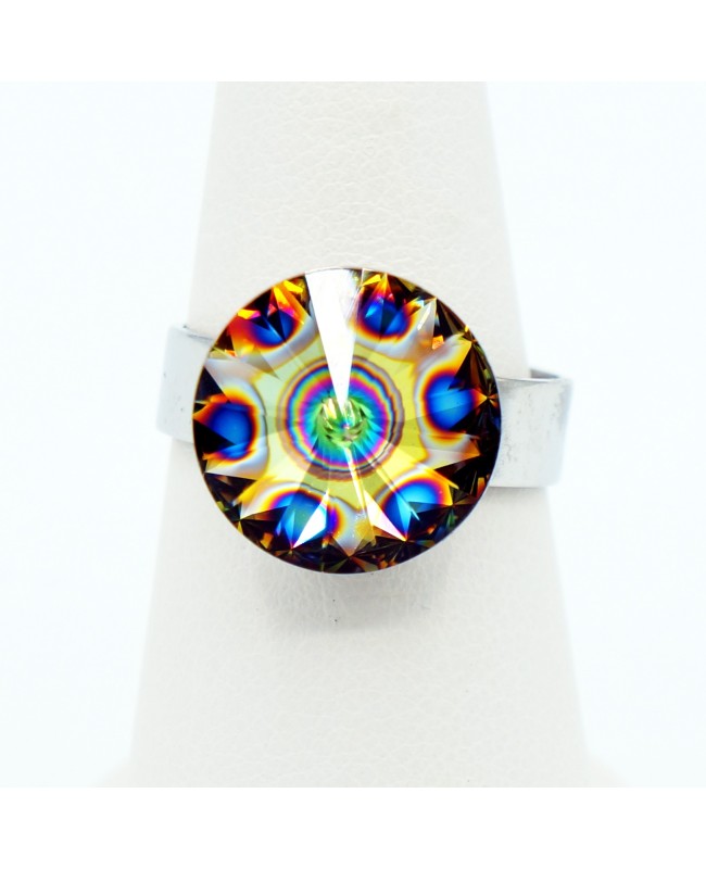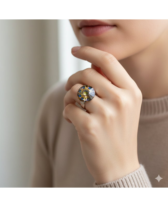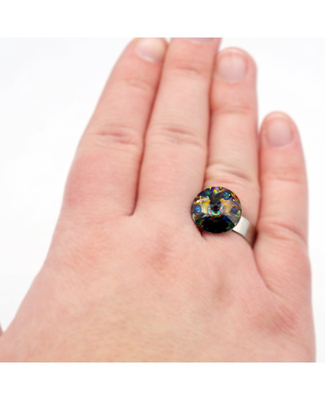This fashion ring features a large round cabochon with multicolored reflections. The stone catches the light and shifts in color depending on the angle, creating a dazzling and unique effect. The cabochon has a diameter of 14 mm.