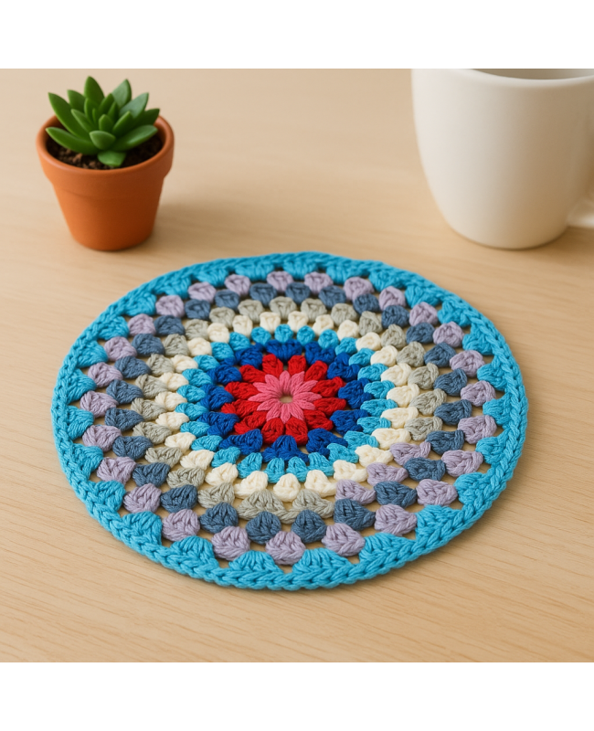 Add a handcrafted touch to your decor with this round crochet doily featuring beautiful shades of blue. Entirely handmade from natural cotton, it brings elegance and softness to your table or sideboard.