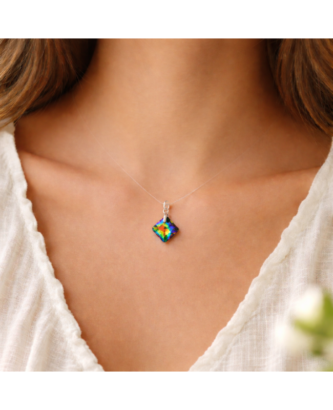 This choker necklace features a square pendant cut from multicolored crystal with iridescent reflections. Depending on the light, it shifts from deep blue to violet, with hints of green and yellow in between. In short, it refuses to choose just one color — and that’s exactly why we love it.
