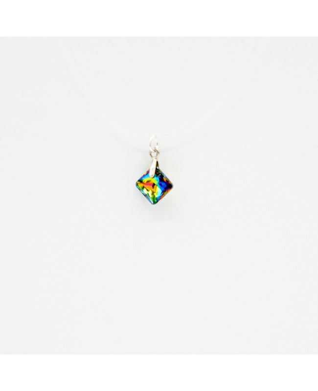 Small in size but big on style, this choker necklace is all about light. Its square multicolored crystal pendant catches every ray and turns it into a mini firework of blue, green, yellow and violet reflections. Yes, even on a grey day, it still shines.