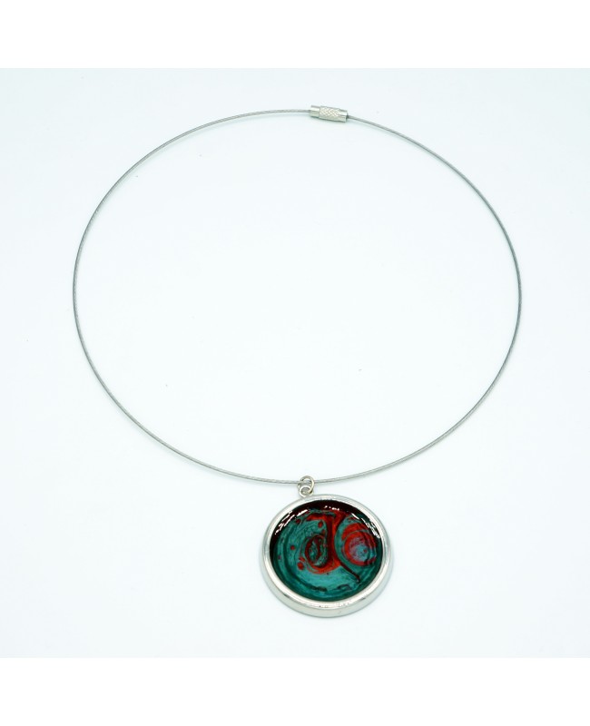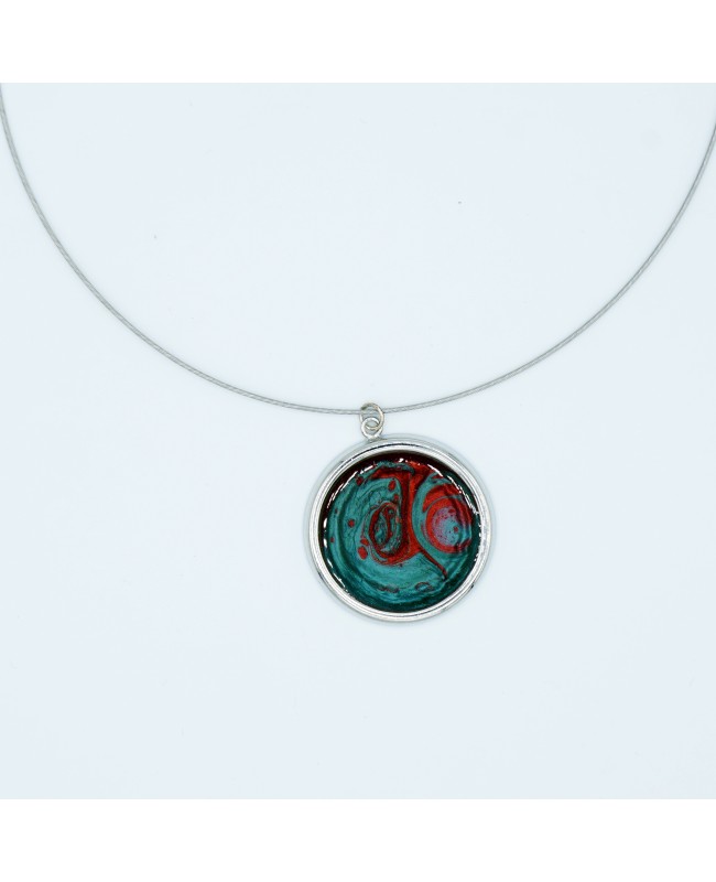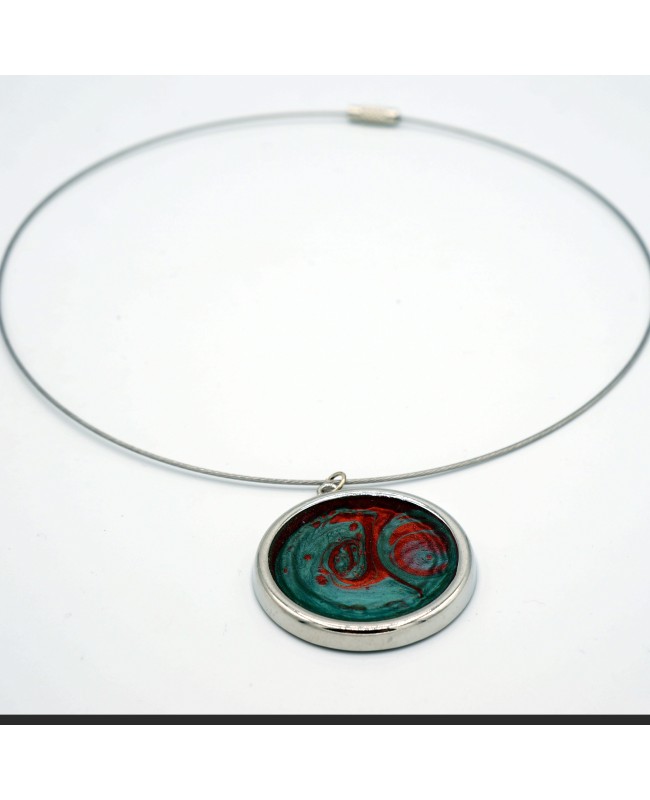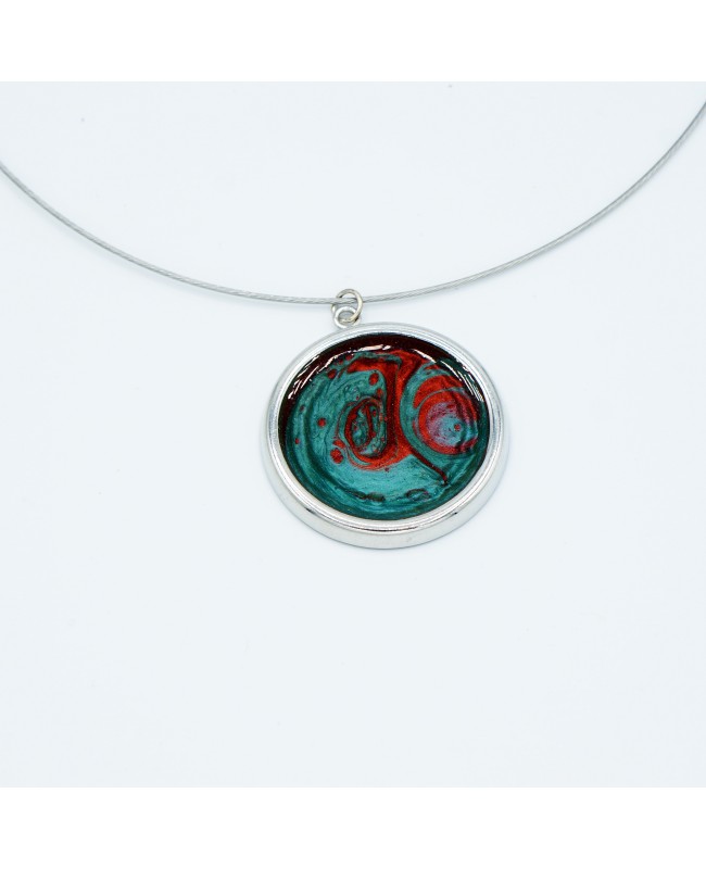 This choker necklace features a round silver-tone metal pendant decorated with hand-applied paint in red and green shades. The colors blend together in a unique abstract pattern and are protected by a glossy resin finish.