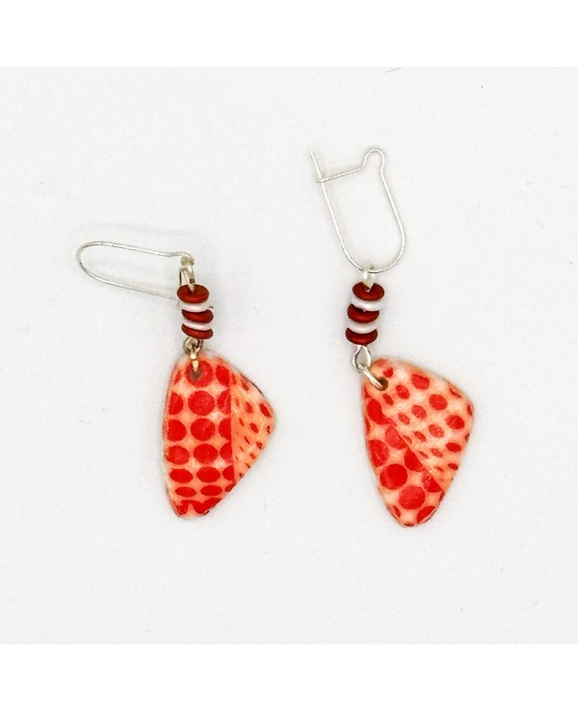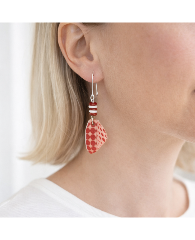 Each piece was handmade in our workshop, then painted with acrylic paint before being protected with a layer of varnish. This final touch helps preserve the colors while adding a beautiful finish. The round and flat red and white seed beads add dimension to the design and create a harmonious transition with the stainless steel findings.