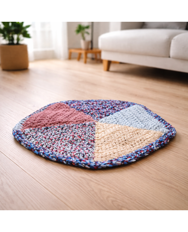Be charmed by this round rug, hand-crocheted in shades of blue, pink, grey, and beige. With its 60 cm diameter and graphic multi-section design, it brings a soft, decorative, and handcrafted touch to your home.