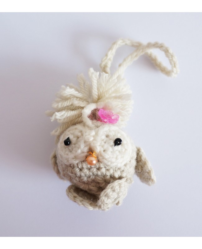 Cette magnifique petite chouette a entièrement été réalisée au crochet. Avec son attache sur la tête, elle pourra s'accrocher partour : à votre sac à main, une poignée de porte, au rétroviseur de votre voiture, etc. Avec sa petite fleur dans les cheveux, elle vous séduira par son originalité. Cette petite chouette peut être accompagnée par son ami le hibou porte-clé.