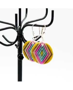 Un nouveau modèle de boucles d'oreilles rondes avec des losanges multicolores. D'une longueur totale de 4,5 cm, la base ronde de ces boucles d'oreilles a été conçue dans notre atelier à partir d'argile polymère. Le motif avec un effet d'optique a été entièrement coloré à la main par nos soins.