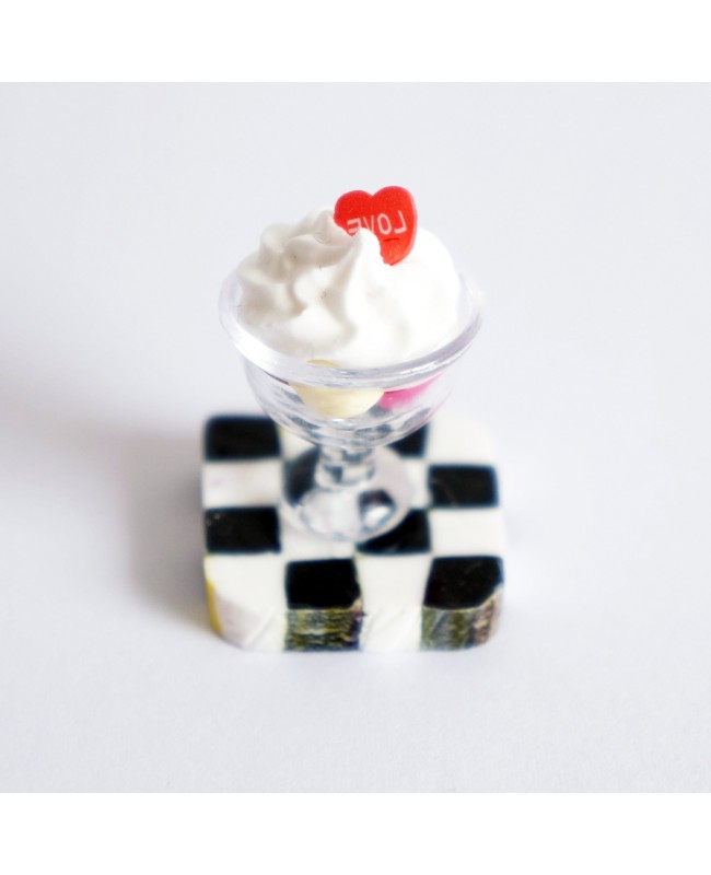 Cette petite coupe de glace ravira tous les amateurs de miniatures, de créations gourmandes ou de magnets. Posée sur un damier noir et blanc, la petite coupe de glace en plastique est remplie de boules de glace, en pâte polymère, vanille, chocolat et fraise. Un peu de fausse chantilly vient compléter le tout pour apporter encore plus de réalisme.