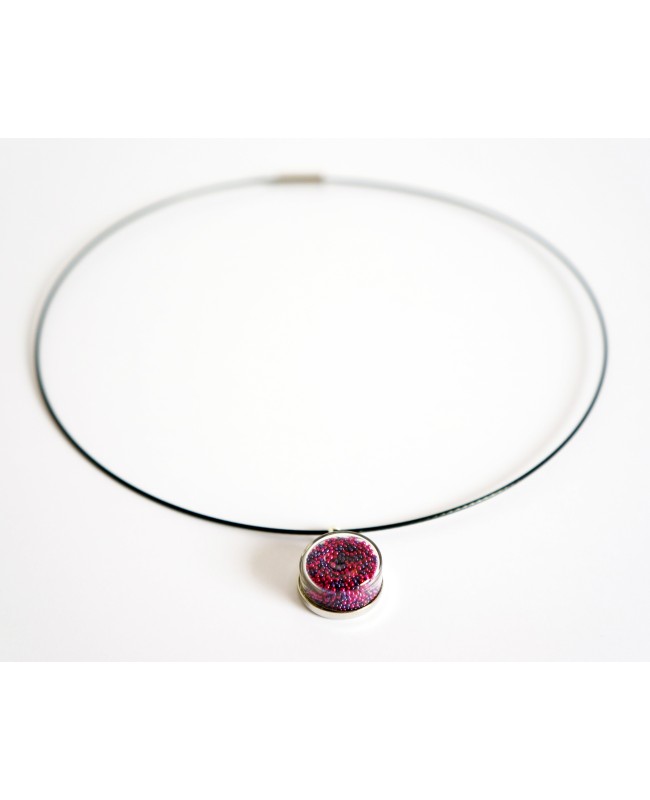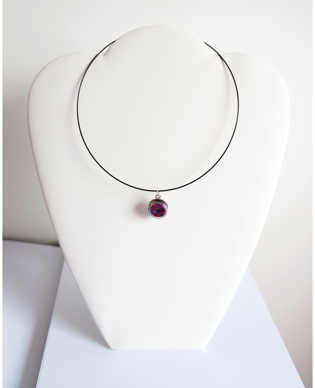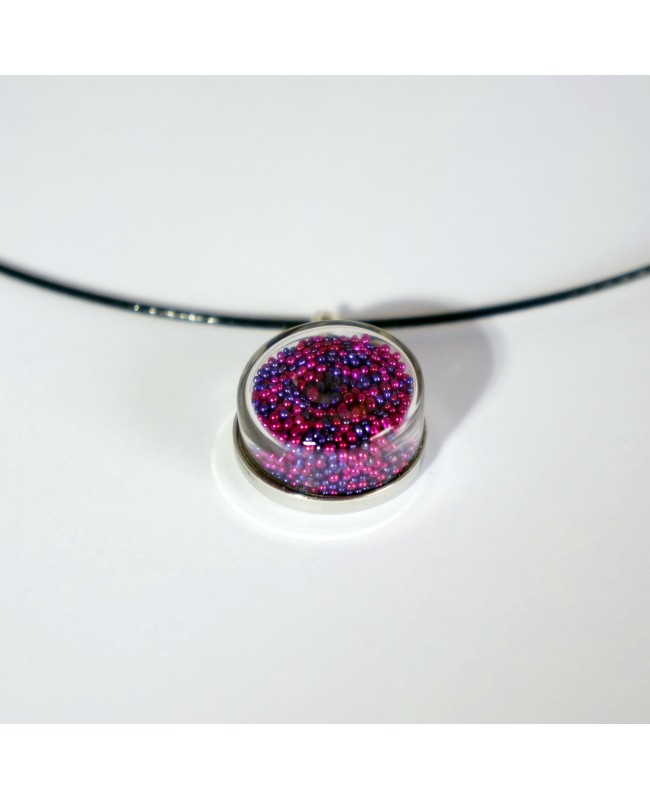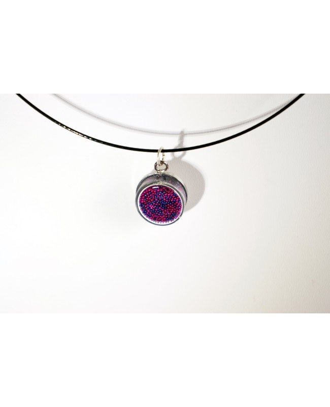 Avec son fil câblé noir, ce petit pendentif a tout pour vous plaire. Avec sa petite taille (1,5 cm), il se fera tout petit. Avec ses couleurs vives (rose et violet), il saura attirer l'oeil, se faire remarquer tout en restant discret.
