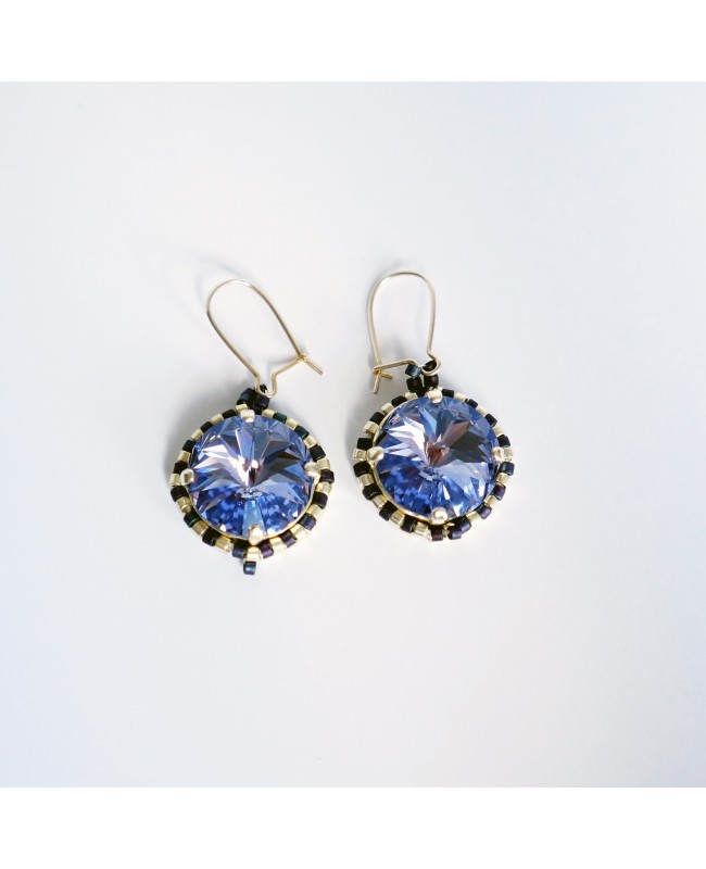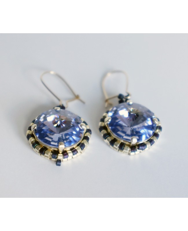 Avec leur centre bleu / violet (ou lavande), ces boucles d'oreilles rondes accompagneront n'importe quelle robe de soirée ou tenue plus simple. Le cabochon en cristal est serti de délicas bleus et argent.