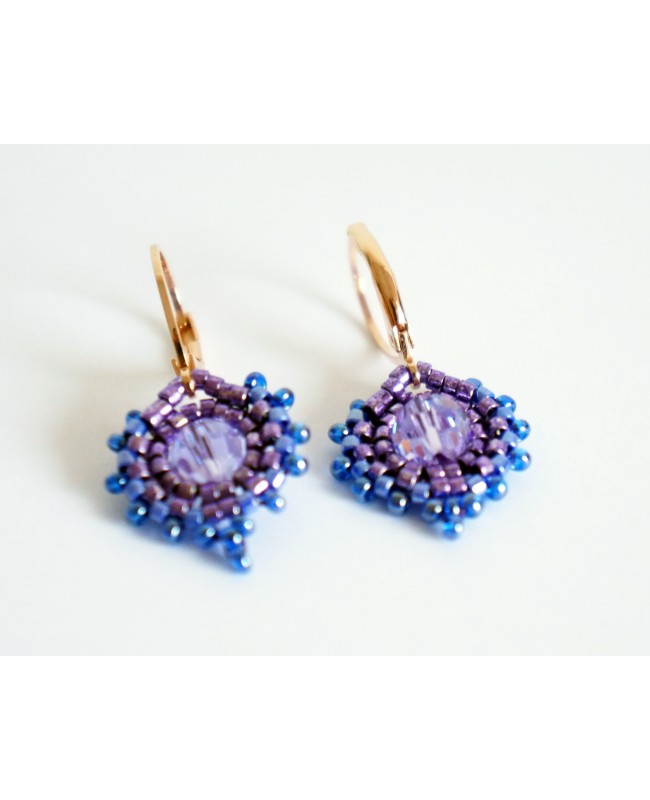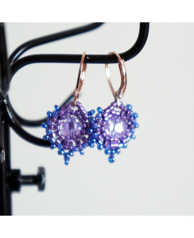 Avec leur forme ronde se terminant en petite goutte, ces boucles d'oreilles bleues et violettes ne laisseront personne indifférent. Entièrement réalisée à la main, elles sont le fruit de l'alliance de perles en cristal de Swarovski et de délicas tissés. Brillantes, classes et originales, l'attache de ces boucles d'oreilles est de couleur "or rose".