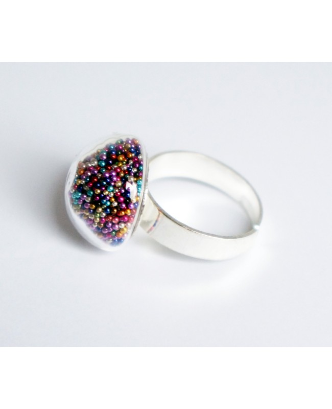 Envie d'un peu de couleur pour cet été? Grâce à cette bague multicolore, vous porterez de la couleur et de la joie tout au long de la journée! Réalisée avec un dôme en verre rempli de microbilles de toutes les couleurs, sa base métallique argentée est adaptable. Oubliez les problèmes de taille, elle s'ajustera à votre doigt!