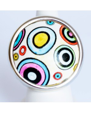 Laissez-vous hypnotiser par cette bague aux cercles multicolores. D'un diamètre de 35 mm, le cabochon de ce bijou fantaisie a été conçu par nos soins à partir d'argile polymère puis coloré avec des encres à l'alcool. Pas de problème de taille puisque vous pourrez modifier la diamètre du support.