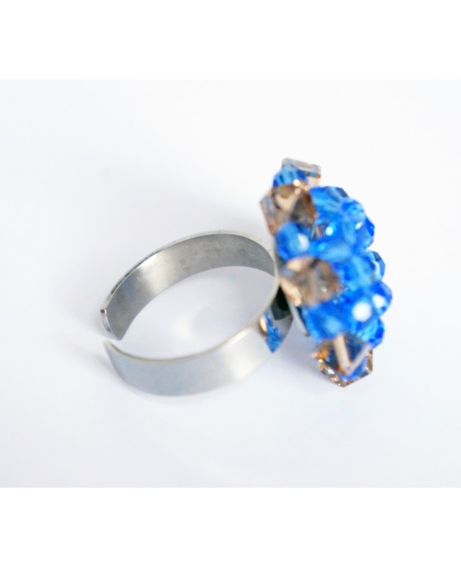Cette bague ajustable a un diamètre de 25 mm. Beige et bleue, elle a été réalisée à partir de perles en cristal de Swarovski. A la fois sophistiquée, moderne et sobre, cette bague fantaisie peut être portée tous les jours et s'accordera à n'importe quelle tenue. Elle a été réalisée par nos soins.