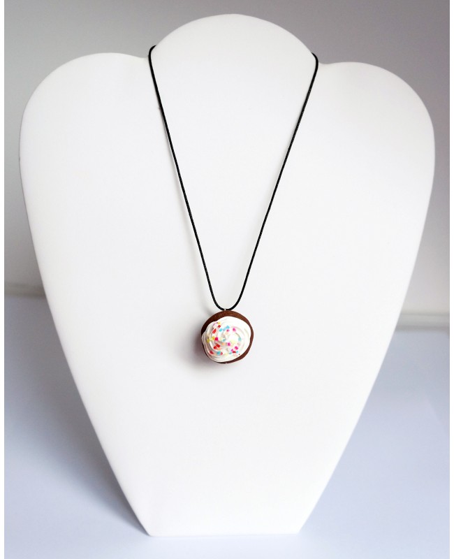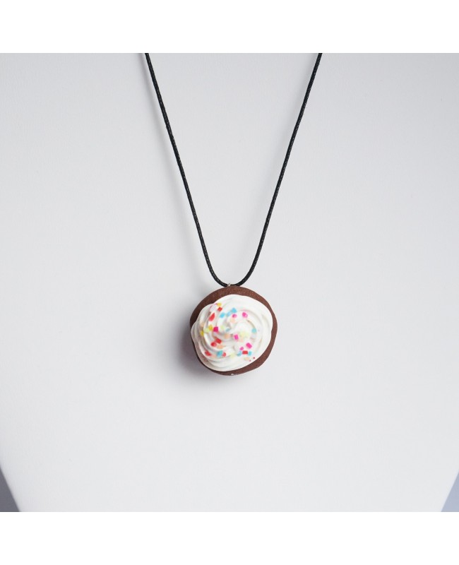 Vous aimez les gâteaux miniatures et les bijoux gourmands? Alors vous apprécierez ce pendentif cupcake au chocolat avec sa chantilly blanche et ses petites décorations multicolores. Entièrement fait main, ce pendentif sera accompagné d'un cordon noir dont la longueur sera adaptée selon votre demande.