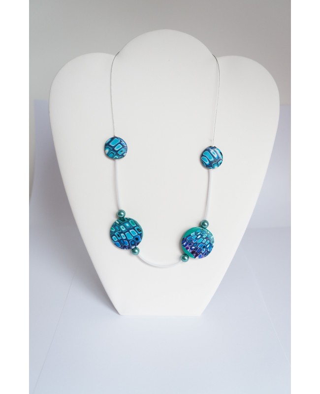 Si vous aimez les bijoux uniques et originaux, vous apprécierez ce collier mi-long, bleu et turquoise, dont les perles plates ont été réalisées à la main. Ce travail artisanal a été entièrement réalisé dans notre atelier en France. Ce collier fantaisie bleu et turquoise est un modèle unique.