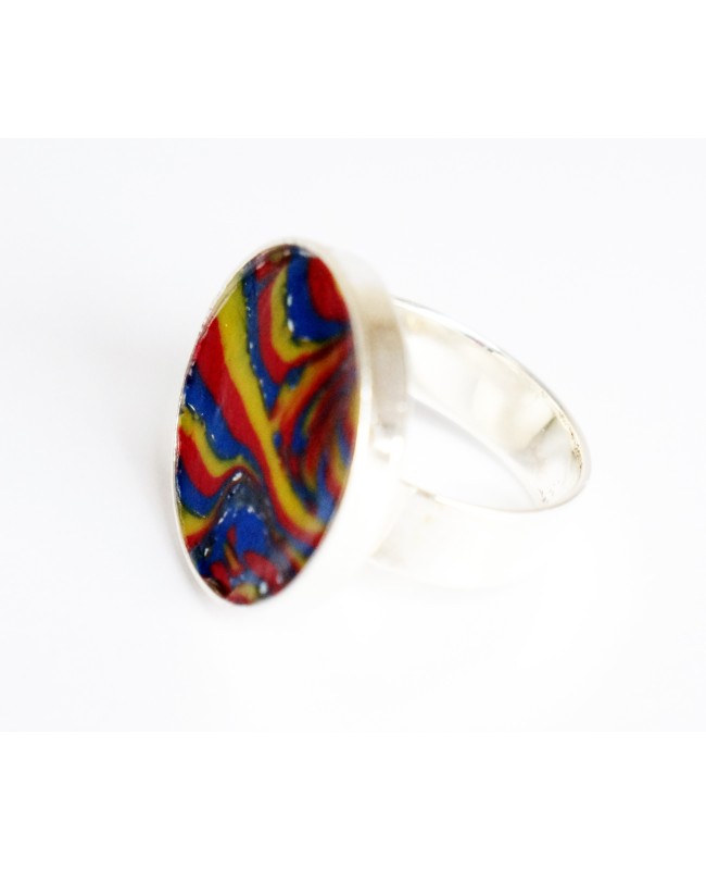 Adepte de l'originalité et des couleurs vives, cette bague est faite pour vous! La partie supérieure mesure 24 mm de diamètre et la base est ajustable. La partie colorée a été réalisée à la main, par nos soins, dans notre atelier en Belgique. Elle a été réalisée en pâte polymère (pâte à modeler qui durcit lorsqu'elle est cuite).