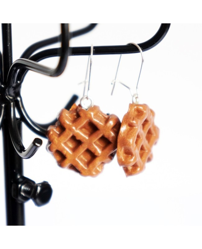 Ces bijoux gourmands ont été réalisés à la main en pâte polymère. Il s'agit d'une pâte à modeler qui durcit lorsqu'elle est cuite. Légères et solides, ces boucles d'oreilles représentent des gaufres de Liège. Tous nos bijoux fantaisie sont réalisés à la main dans notre atelier situé en Belgique.