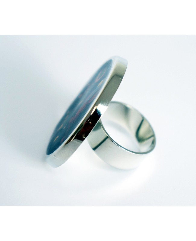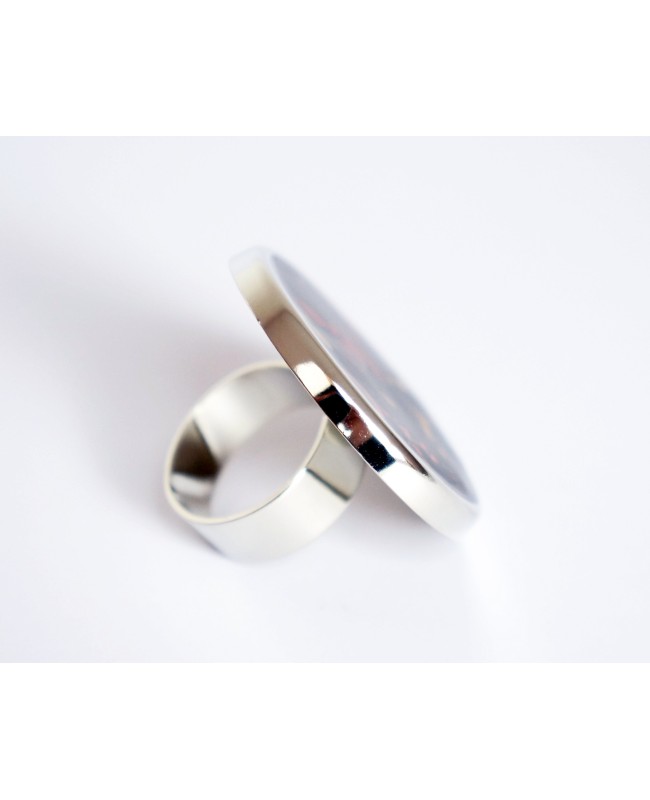 Issue d'un travail artisanal, cette bague fantaisie n'est disponible qu'en un unique exemplaire. Réalisée sur un support métallique argenté, la partie supérieure a été réalisée à partir de peinture. Afin de la protéger, une couche de résine a été ajoutée. Cette bague a été réalisée dans notre atelier.